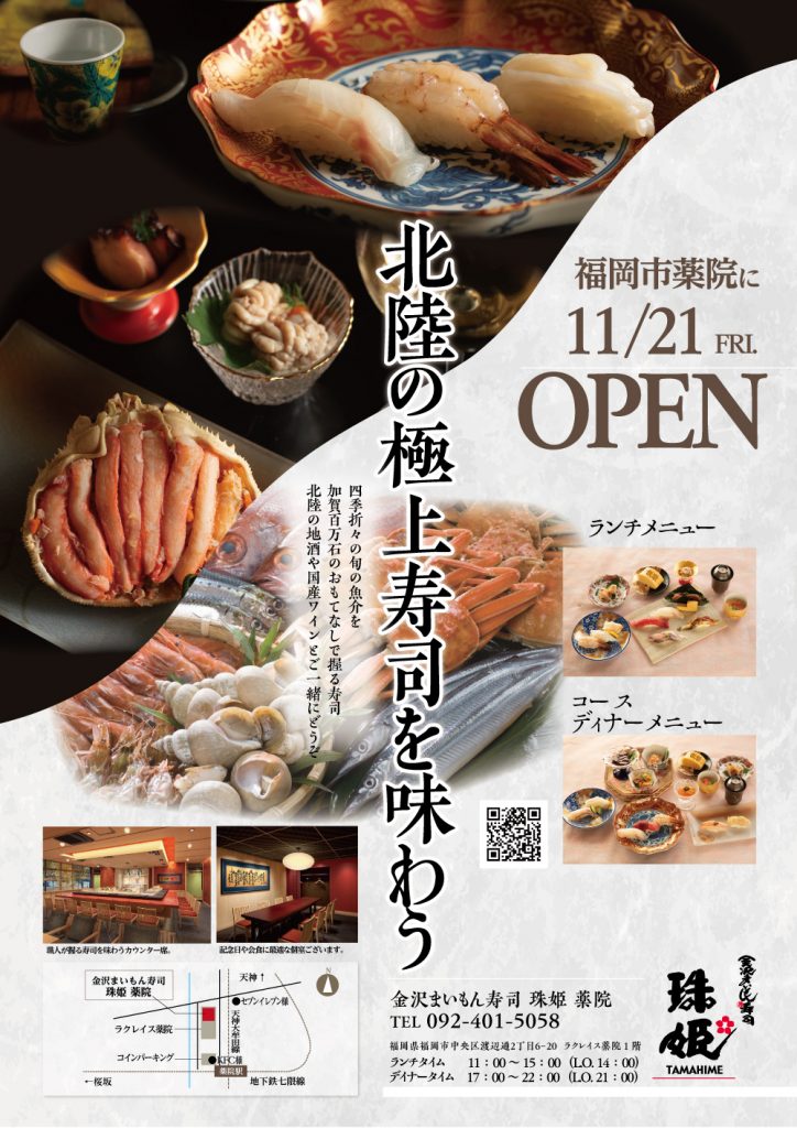 福岡市薬院に「金沢まいもん寿司 珠姫」11/21OPEN!