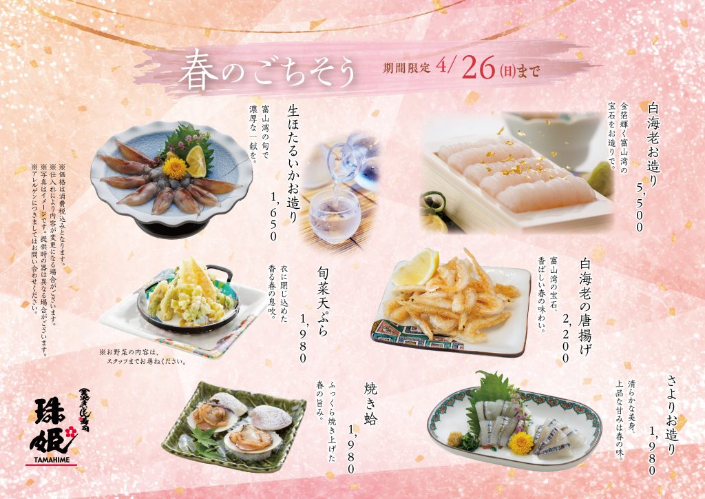 金沢まいもん寿司 珠姫 薬院では、この時期にしか味わえない格別なごちそうを取り揃えた「春フェア」を開催いたします。