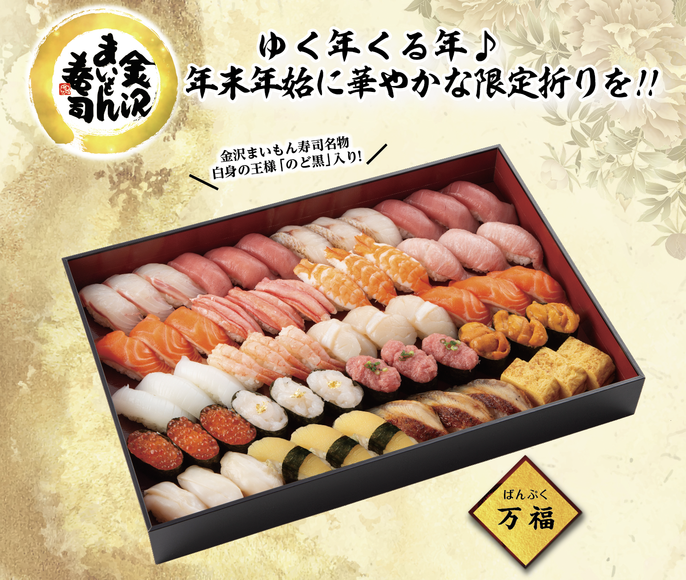 昨年ご好評いただいた 年末年始の席を盛り上げる特別折りが 今年も登場いたします。 多くの幸せと健康を願い60貫を盛り込んだ 特別折り「万福(...