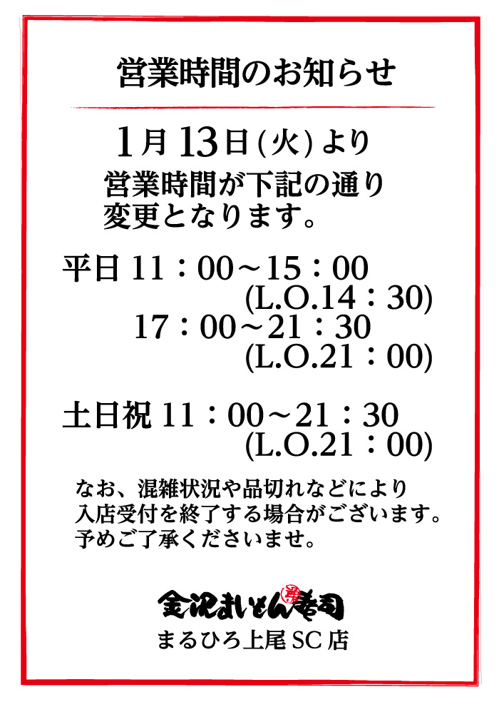 営業時間のお知らせ(まるひろ上尾SC店)