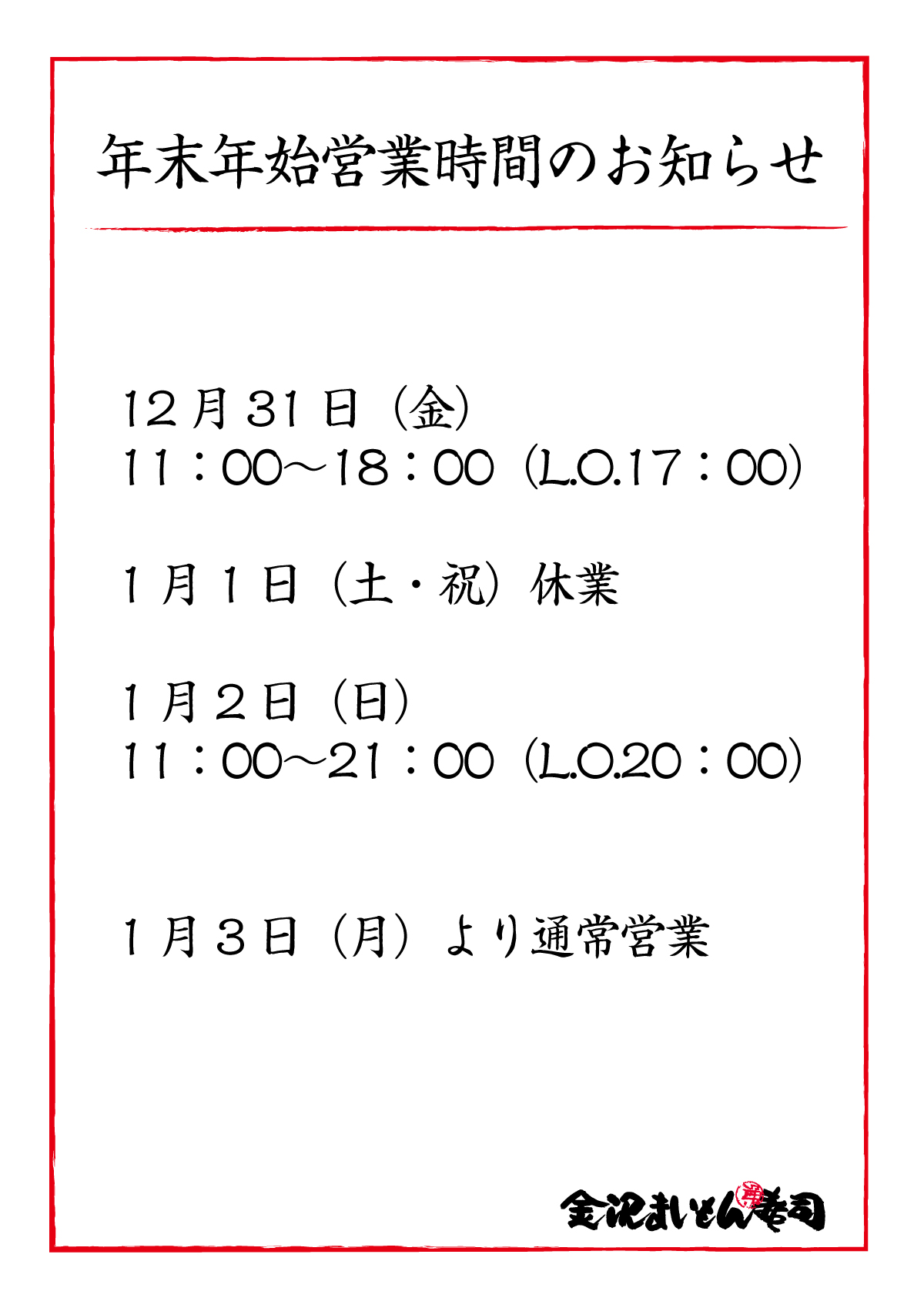 お知らせ ←お知らせ一覧に戻る 2021年12月7日 年末年始営業時間のお知らせ(上野店) 金沢まいもん寿司上野店の 年末年始営業時間のお知らせです。 12月31日(金) 11:00〜18:00(L.O.17:00) 【当日のテイクアウトは承れません。 必ず前日までにご予約をお願いいたします!】 1月1日(土・祝)休業 1月2日(日) 11:00〜21:00(L.O.20:00) 1月3日(月)より通常営業