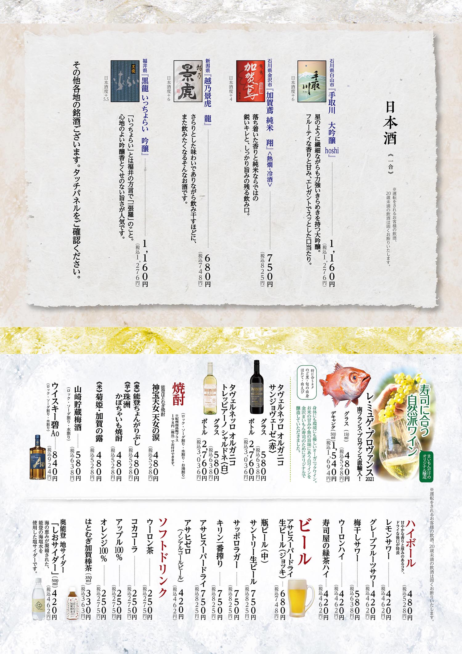 ←店舗一覧に戻る 【店舗のお知らせ】 2025.12.16金沢まいもん寿司 まるひろ上尾SC店 12月22日グランドオープン! 金沢まいもん寿司 まるひろ上尾SC店 埼玉県上尾市宮本町1番1号 まるひろ上尾SC 6階 TEL 048-788-1461営業時間:11:00〜21:30 ※ラストオーダー21時 GoogleMapでみる グランドメニュードリンクメニュー